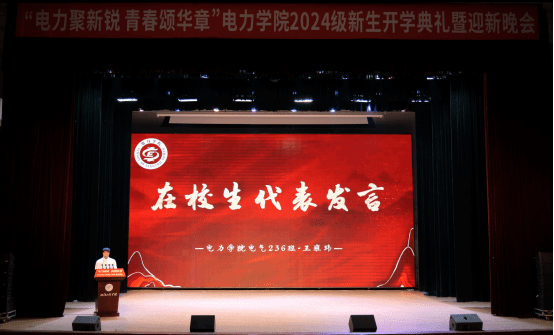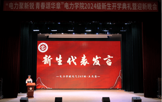 2024级电气245班王天意同学代表全体新生发言。他表示,能够成为电力学院的一员感到无比自豪,将传承“红心向党,技术报国”的红色基因,做又红又专又实的应用型高级专门人才,投身东北振兴,为辽宁高质量发展作贡献,为实现自己的人生目标而努力拼搏。