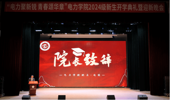 10月16日下午,电力学院在大学生活动中心隆重举行2024级新生开学典礼暨迎新晚会,电力学院院长赵毅、党委书记王隽、副院长王刚出席开学典礼,全体教师和辅导员、家长代表以及全体2024级新生一同参加典礼,开学典礼由学院副书记兼副院长胡曼霖主持。