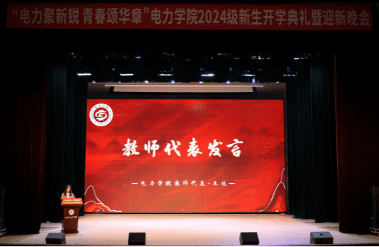 电气工程与智能控制专业系主任王欢博士代表全体教师发言。她说到:作为教师,我们将与你们一同成长,一同探索知识的海洋。我们不仅是知识的传授者,更是你们人生道路上的引路人。我们希望都能在电力学院找到自己的兴趣所在,发掘自己的潜能,实现自己的梦想。