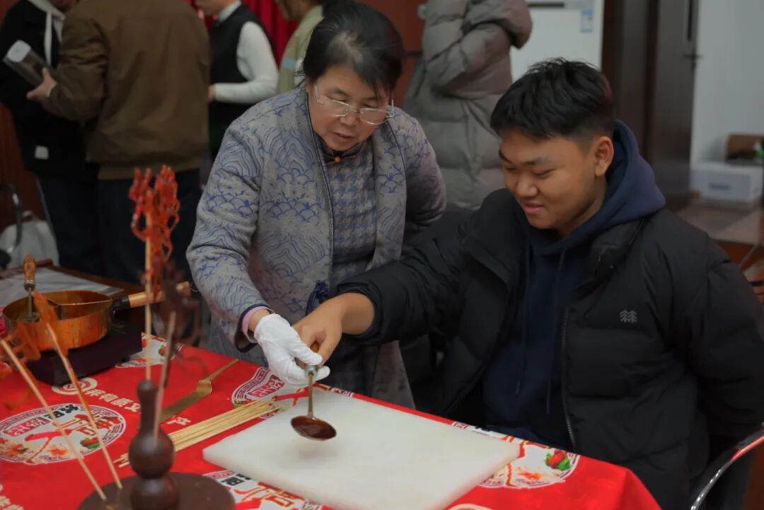 现场分为静态展示区与动态体验区两个板块。静态展示区师生可通过观赏以莲、青松等为意象的剪纸、草编作品和本土非遗项目,直观感受传统文化魅力与廉洁自律的内涵。体验环节,师生分赴“红船剪纸”工坊,在刀剪流转间铭记建党初心与使命;参与“糖画廉莲”工坊,于糖丝勾勒间体悟清廉品格;动手“草编红鱼”工坊,借编织纹理筑牢红色基因;学习“面塑红军”工坊,在捏形塑貌中传承红军精神。