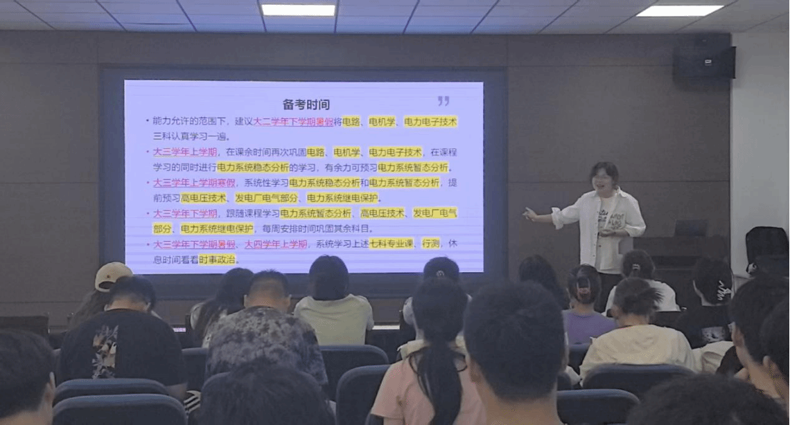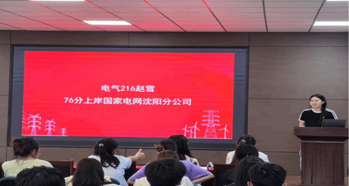 以76分的成绩考入沈阳供电公司的电气216班赵雪,介绍了当前国网的考试形式与招聘要求,鼓励同学们“以终为始、分阶段突破”,避免焦虑影响备考效率。电气213班陈钇如以70分的成绩上岸国家电网抚顺供电公司,她则系统梳理考试大纲,强调《电力系统继电保护》、《电力系统分析》等核心课程的重要性,并与大家分享了她的时间管理方法。